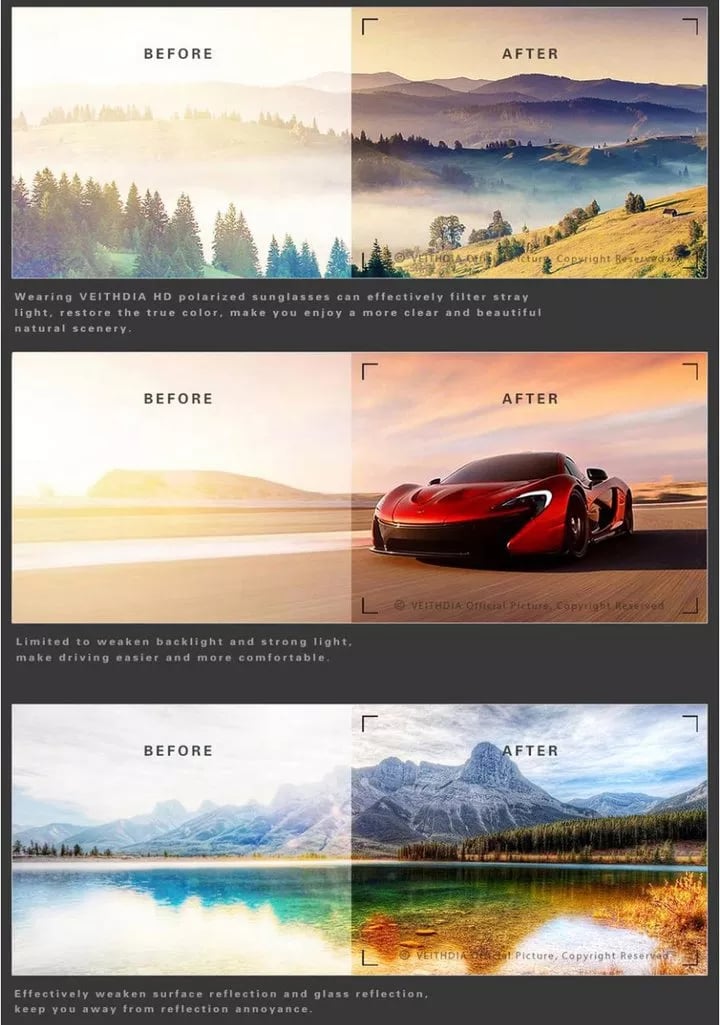 SPOLARYZOWANE SOCZEWKI OCHRONNE 【UV400】. Te nowo zaprojektowane okulary przeciwsłoneczne z polaryzacją są lepsze od poprzednich okularów przeciwsłonecznych na trzy sposoby - podczas poruszania się w pomieszczeniach lub na zewnątrz. Po drugie, spolaryzowane soczewki redukują odblaski i oślepienia. Jednocześnie powłoka zapewnia 100% ochronę przed szkodliwym promieniowaniem UVA/UVB.