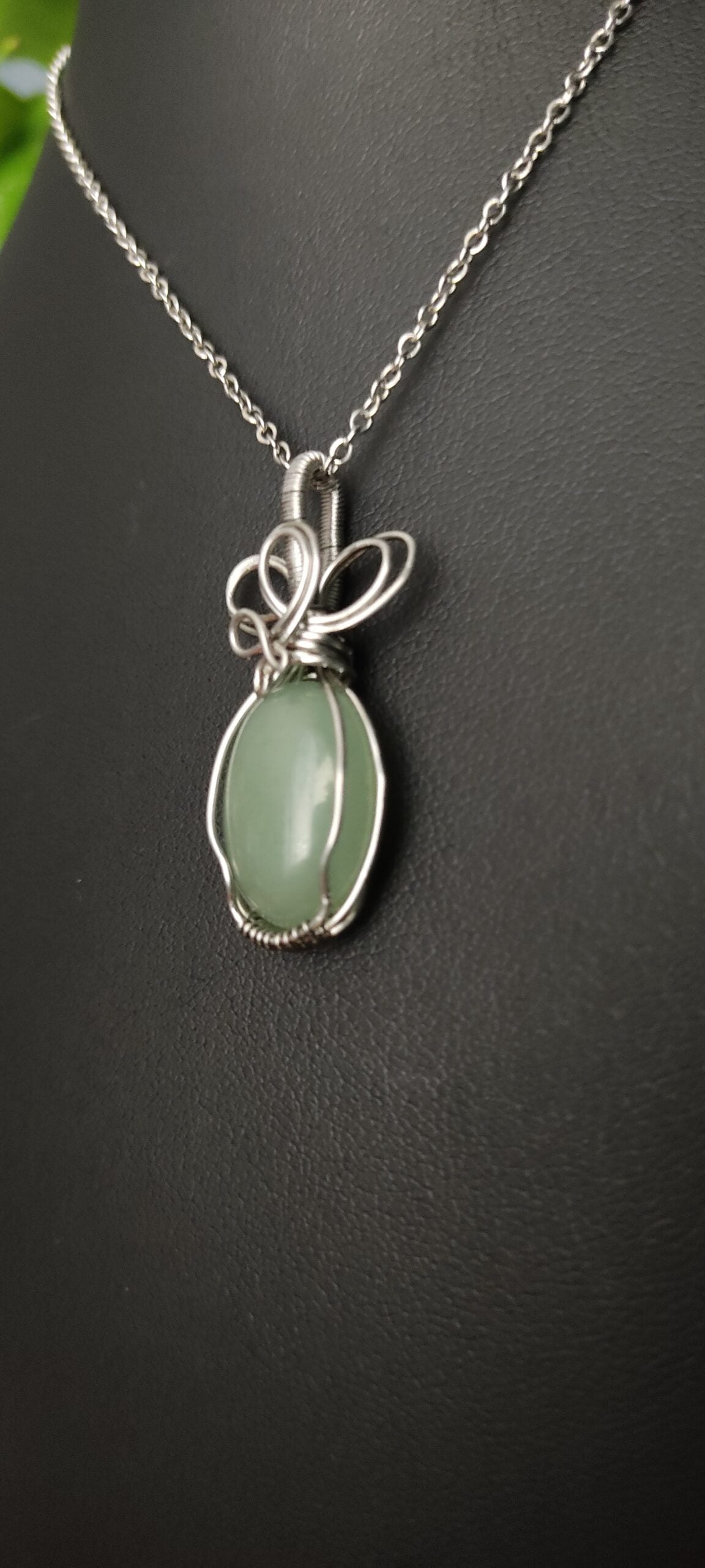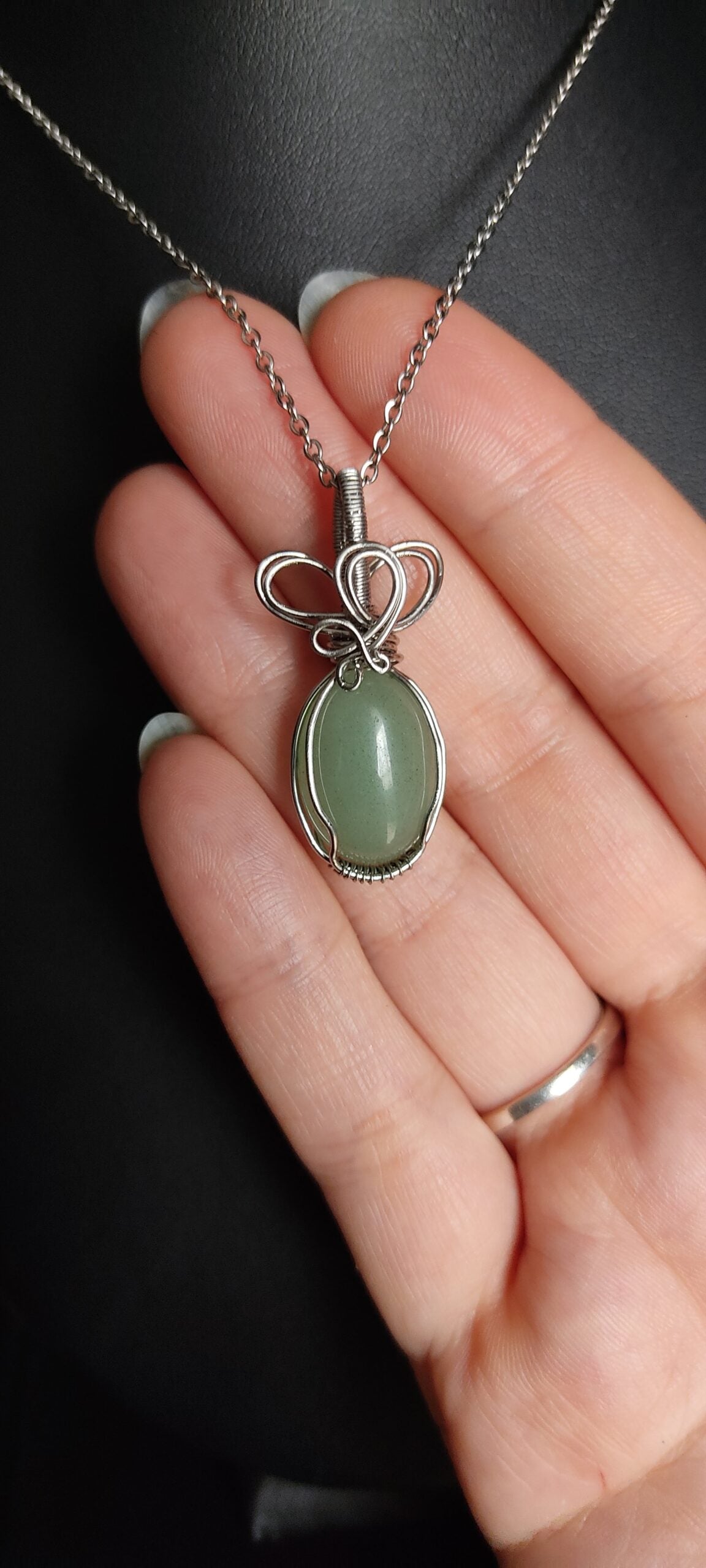 Ręcznie robiony wisiorek z awenturynem. Wykonany techniką wire wrapping z drutów ze stali chirurgicznej.