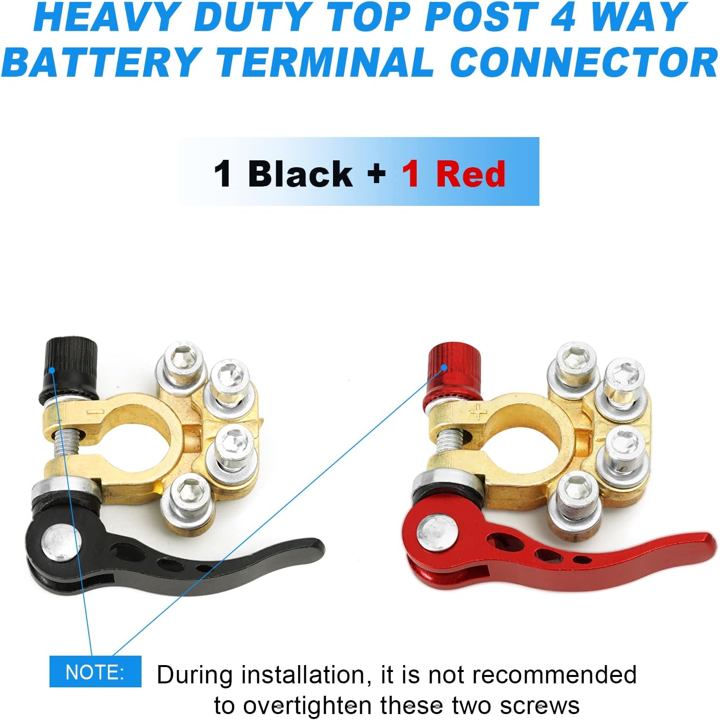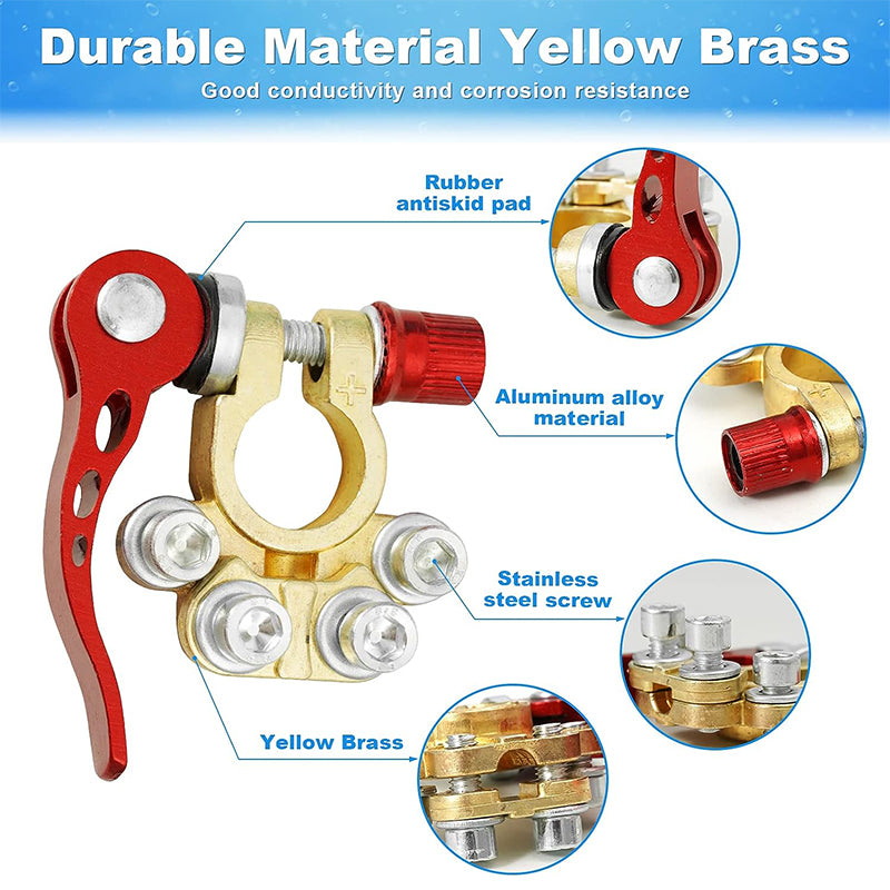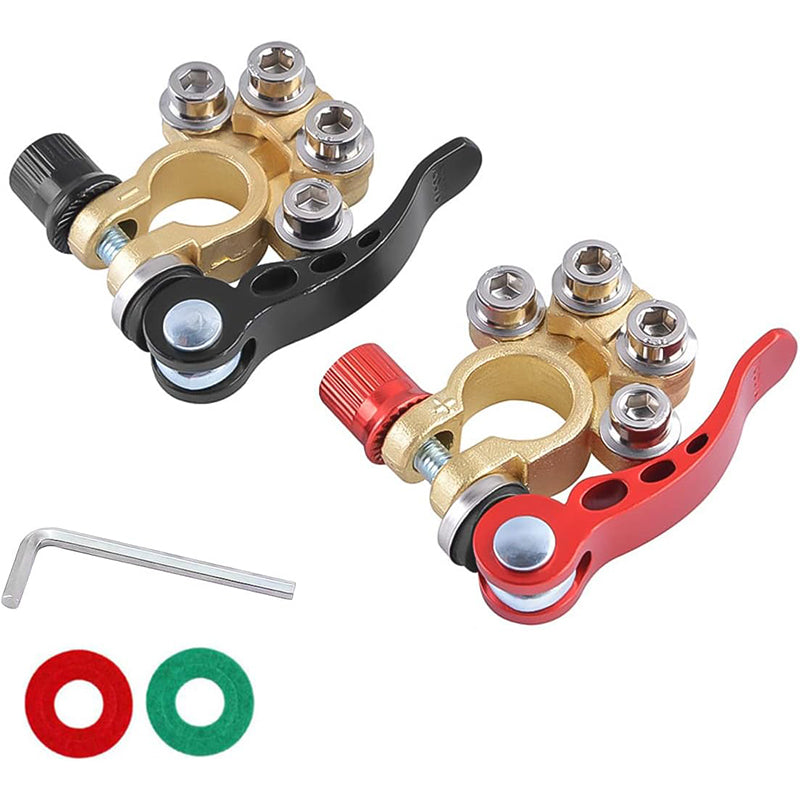 [4-KIERUNKOWY ZACISK AKUMULATORA] Wykonany z wysokiej jakości mosiądzu i stali, odpornej na korozję i charakteryzującej się doskonałą przewodnością elektryczną, która redukuje zniekształcenia napięcia i straty przesyłu. Posiada 4 porty do podłączania wielu kabli, co ułatwia i uprzyjemnia modyfikację okablowania.