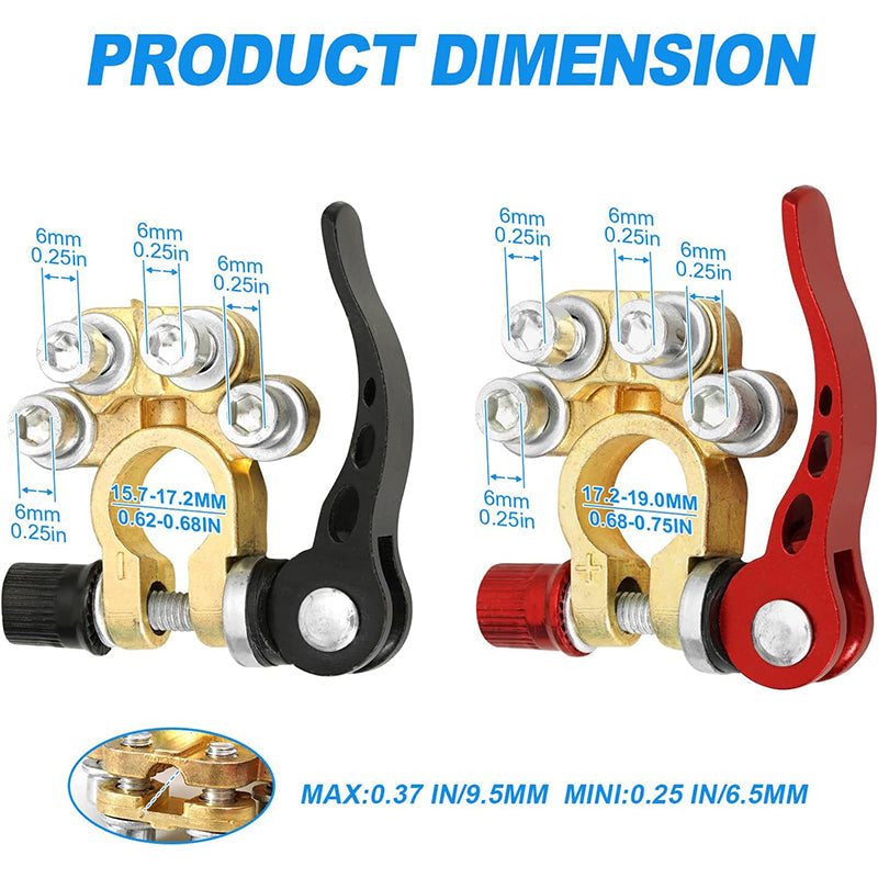 [SZEROKIE ZASTOSOWANIE] Nasze złącza zacisków akumulatora są kompatybilne z samochodami osobowymi, vanami, przyczepami kempingowymi, tachografami, ciężarówkami, pickupami, autobusami itp. Pasują do akumulatorów samochodowych z okrągłymi zaciskami SAE/JIS typu A. Należy upewnić się, że właściwy zacisk jest podłączony do właściwej polaryzacji.