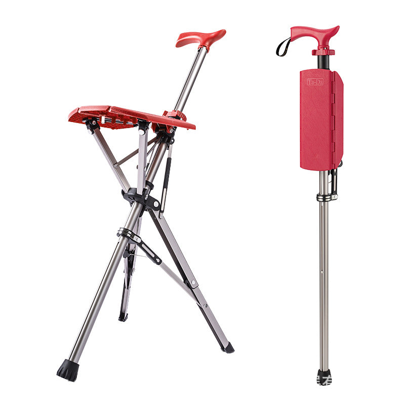 Przenośne składane krzesło z laską --- Niemiecka ręcznie wykonana konstrukcja, regulowana wysokość, odpowiednia dla osób starszych do poruszania się i użytkowania