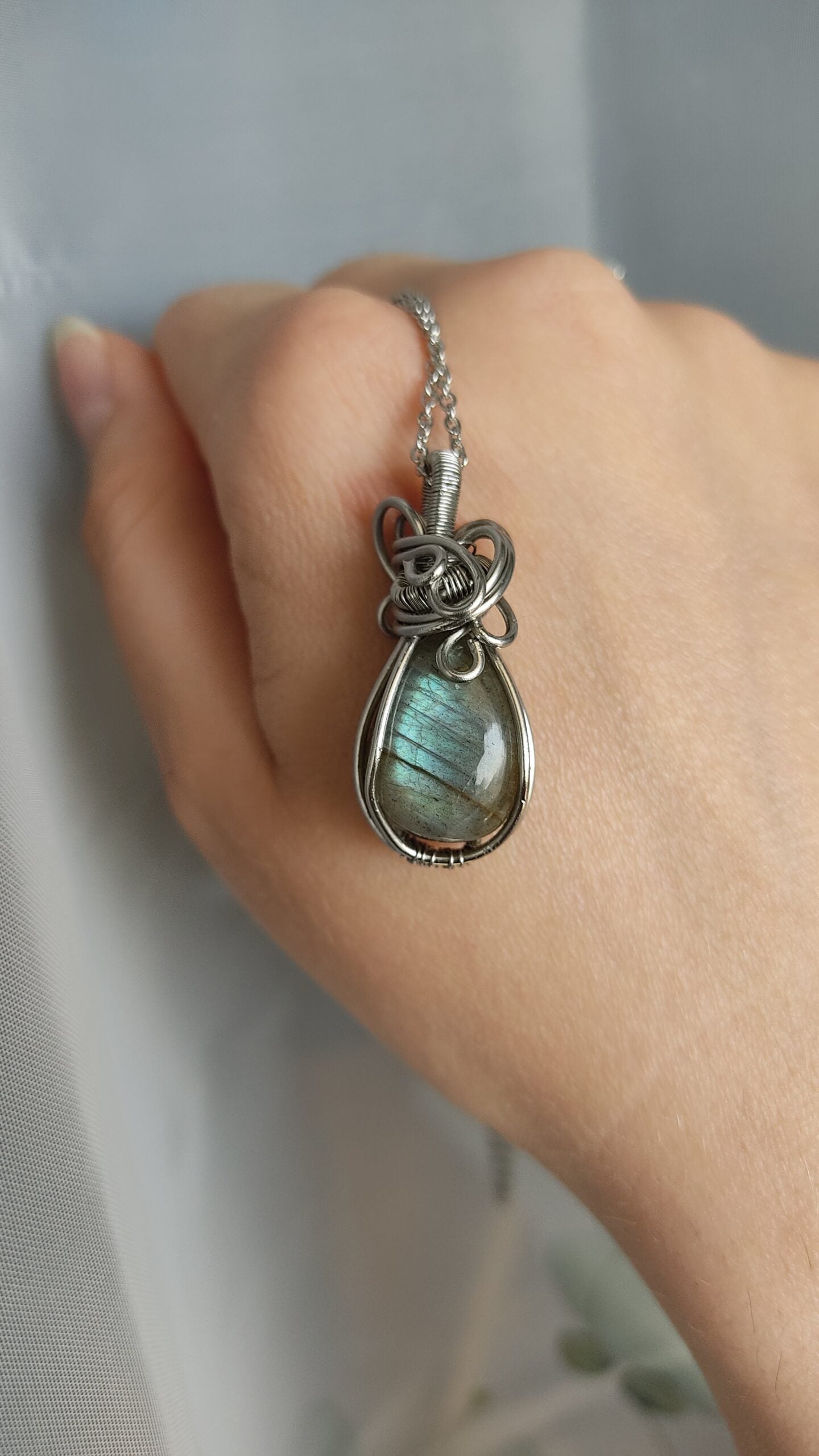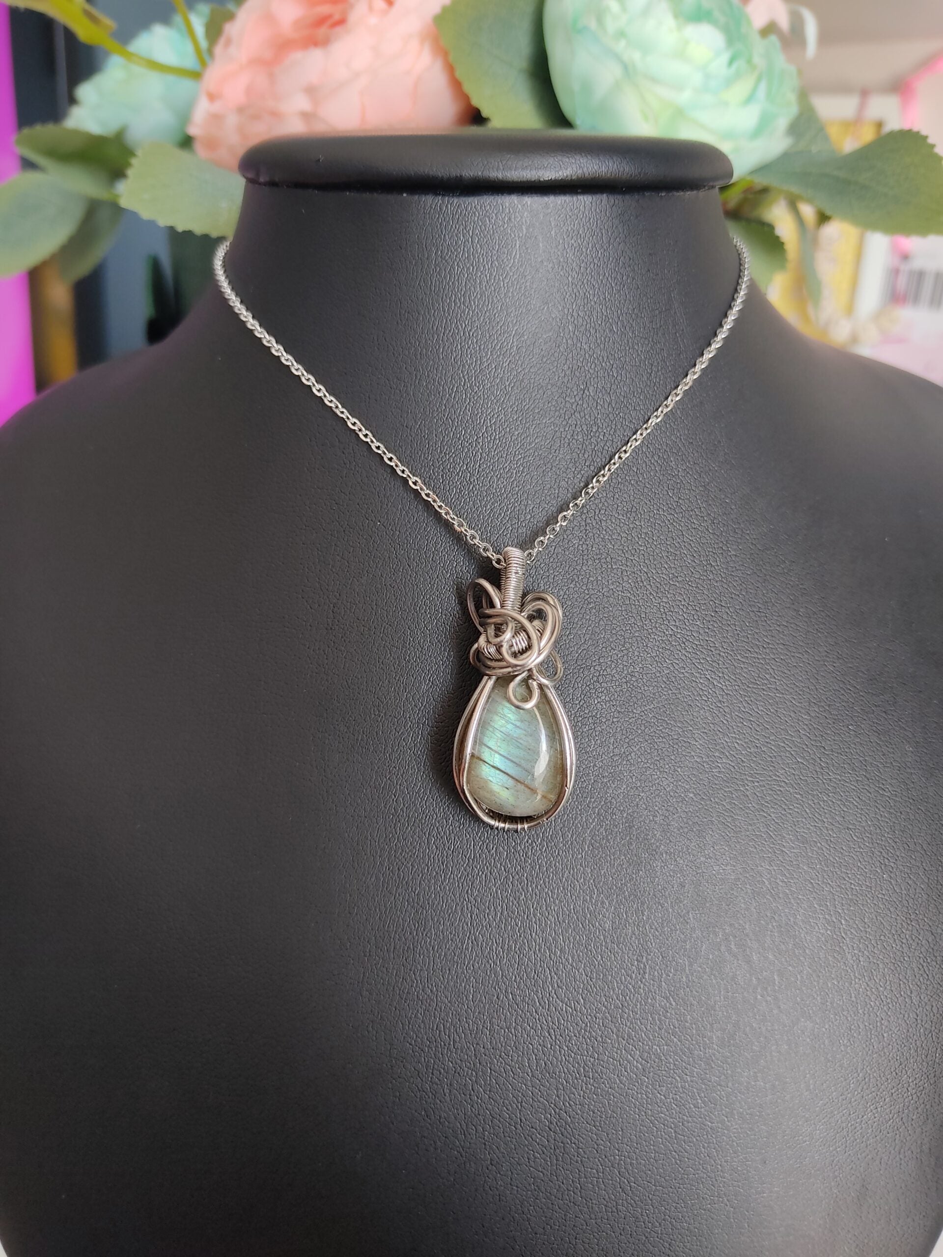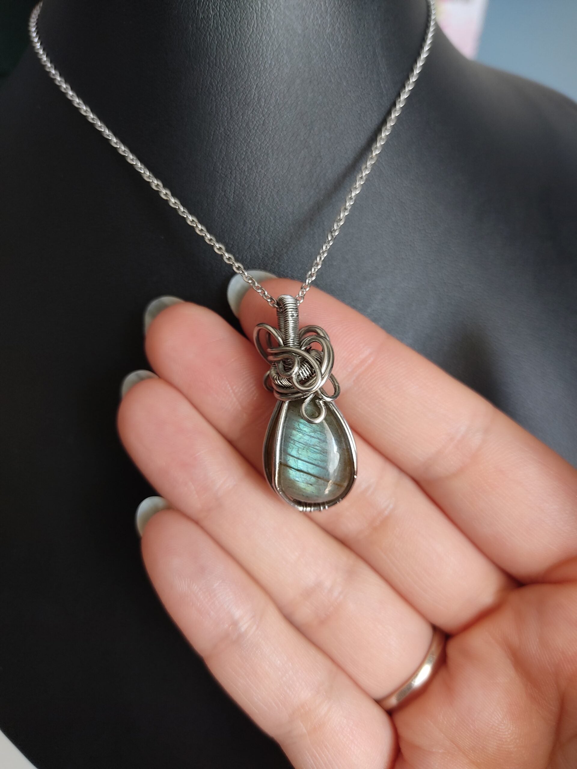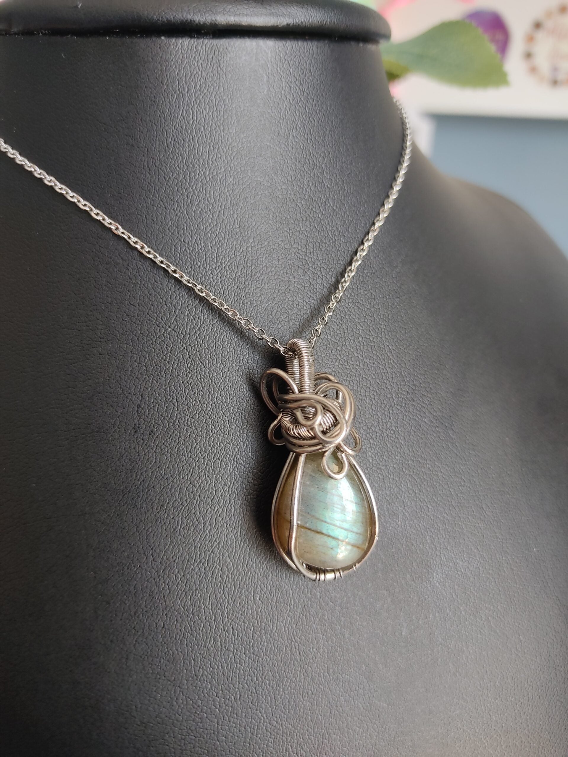 Ręcznie robiony wisiorek z labradorytem. Wykonany techniką wire wrapping z drutów ze stali chirurgicznej.