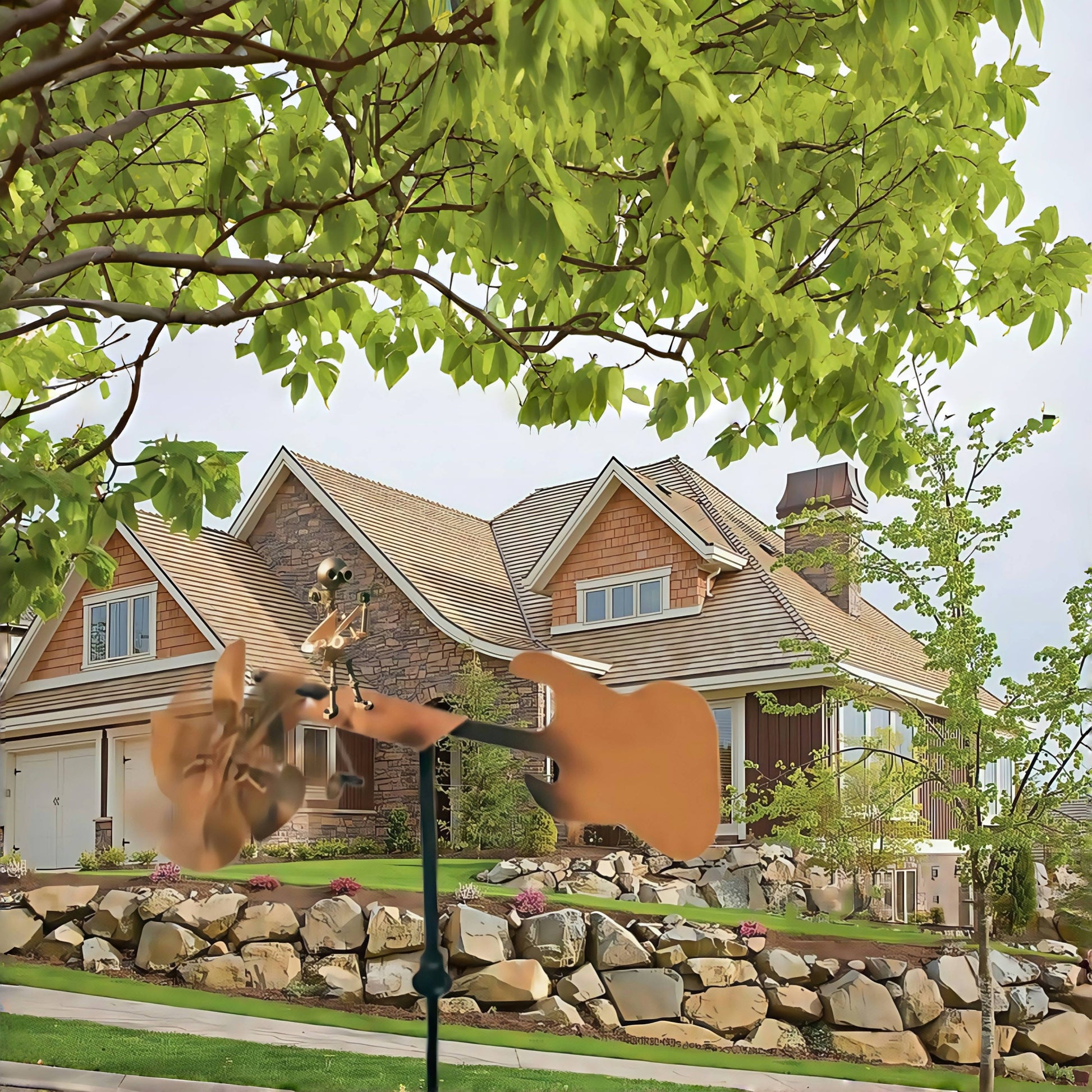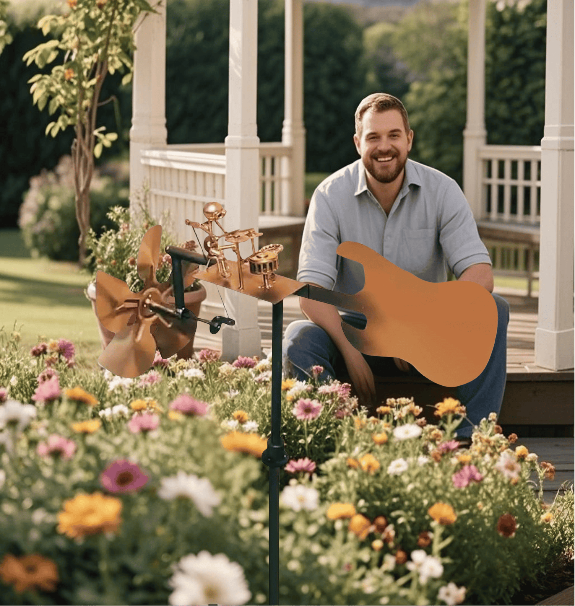 🎸 Nasz WYJĄTKOWY, ręcznie spawany, metalowy wiatrak ma figurkę bujającego gitarzysty i perkusistę, który gra szybciej, gdy wieje wiatr 🎸