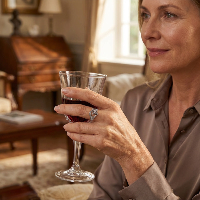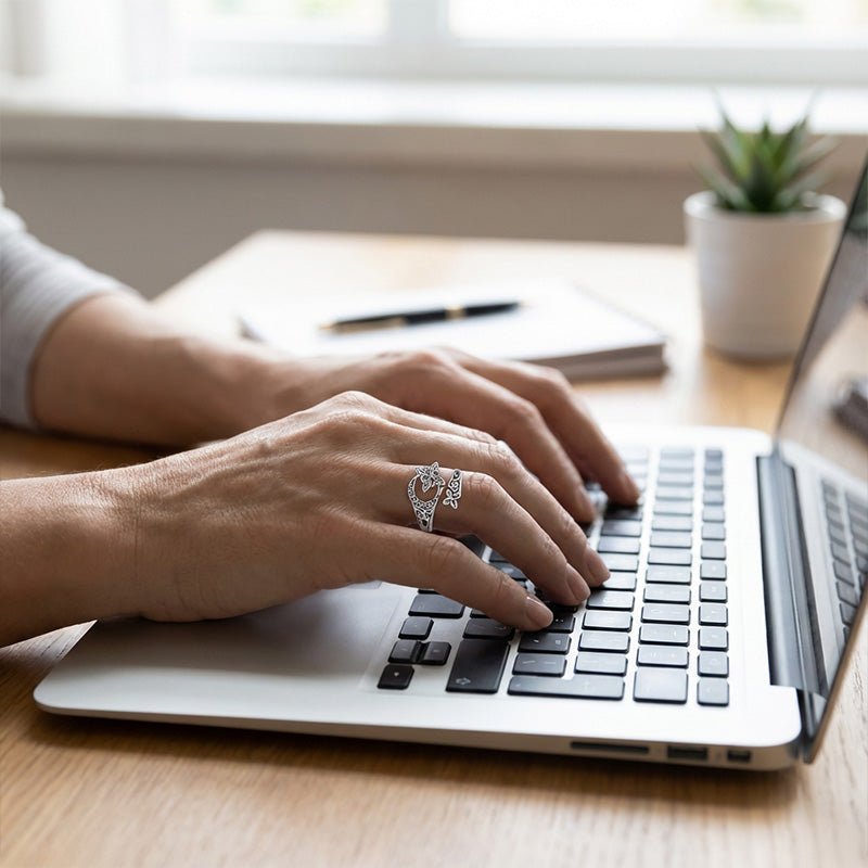 Praktyczny, otwarty design umożliwia delikatną regulację rozmiaru, dzięki czemu pierścionek dopasowuje się do większości palców bez potrzeby dokładnego mierzenia.