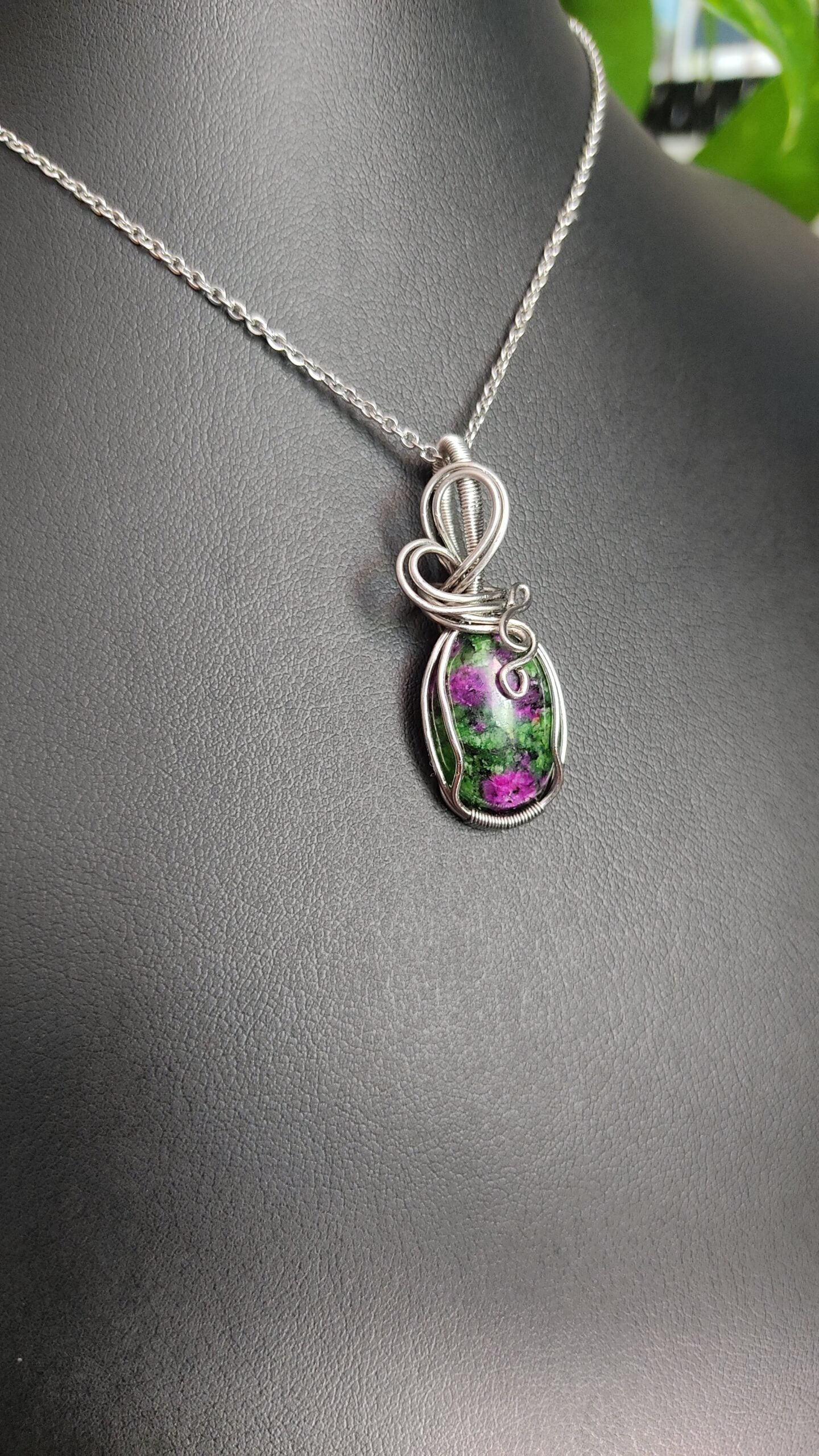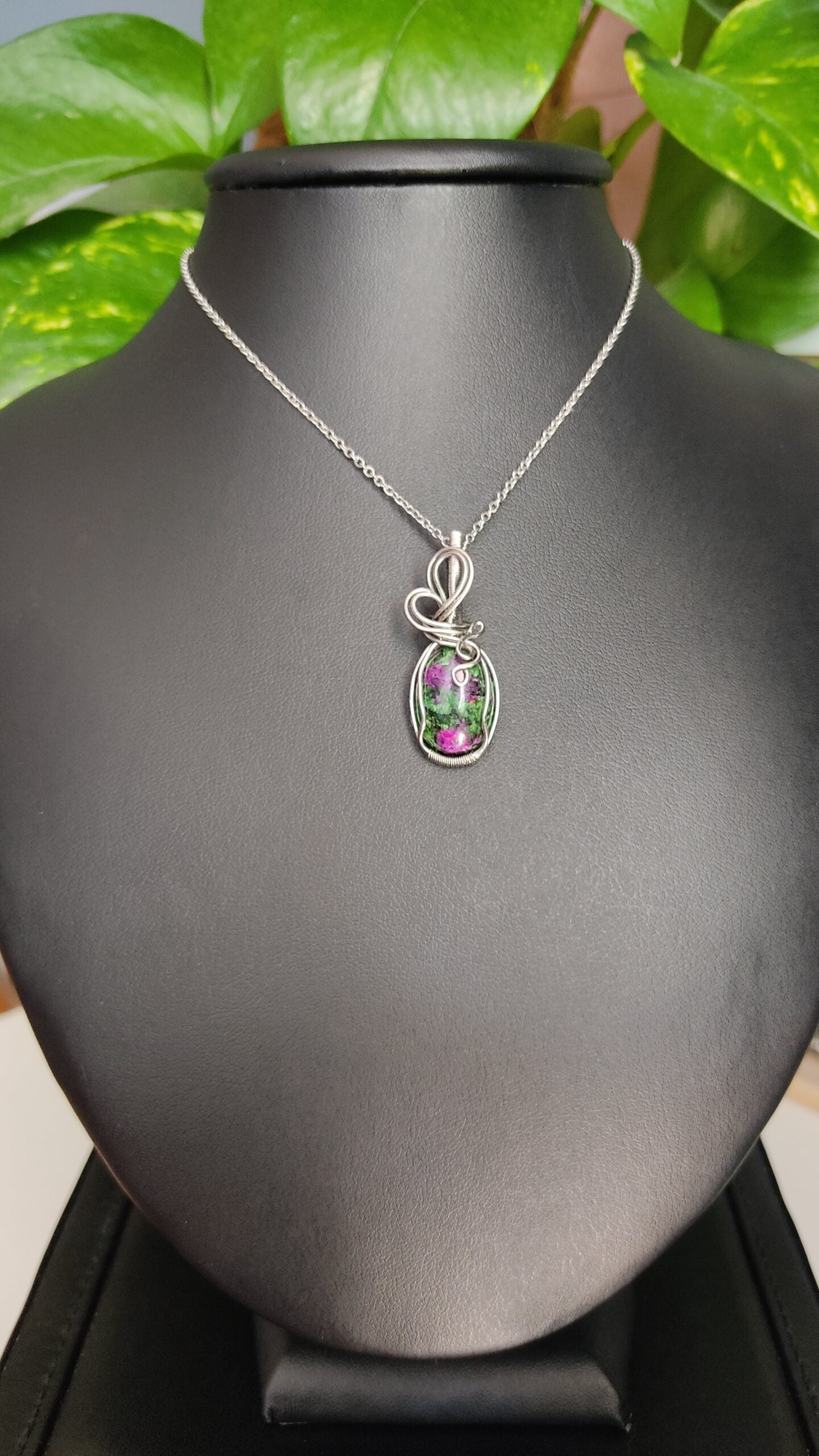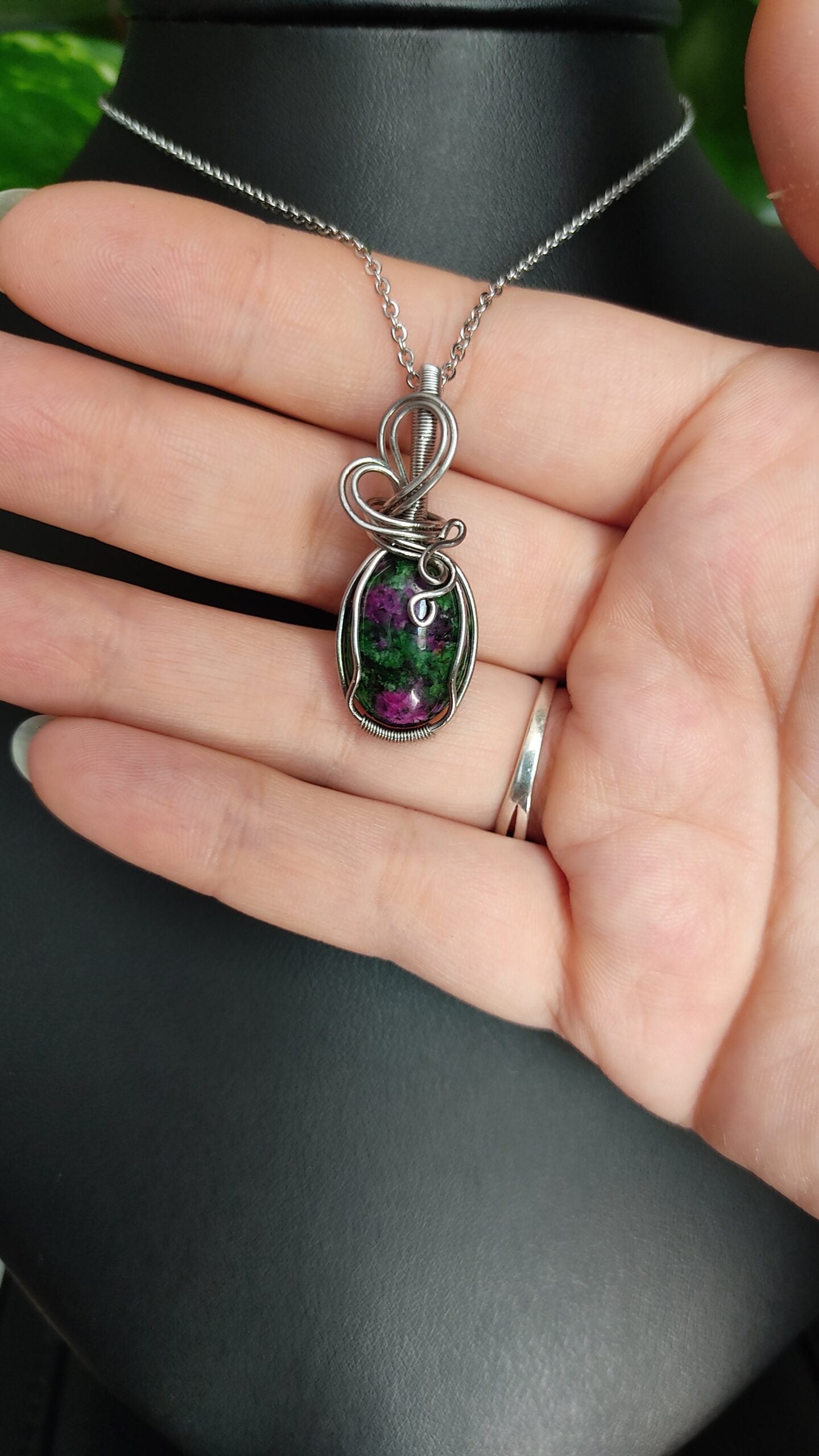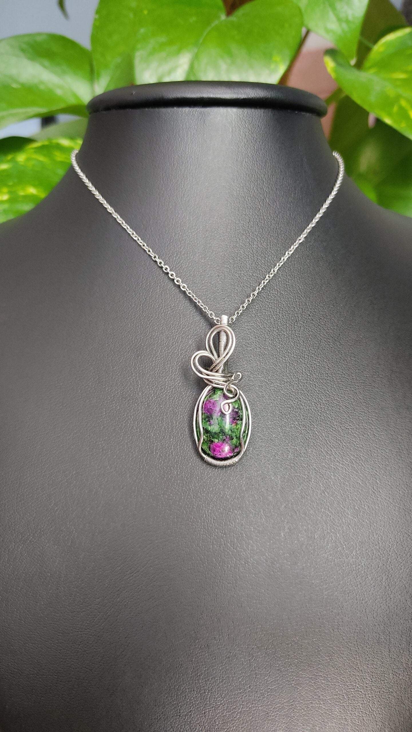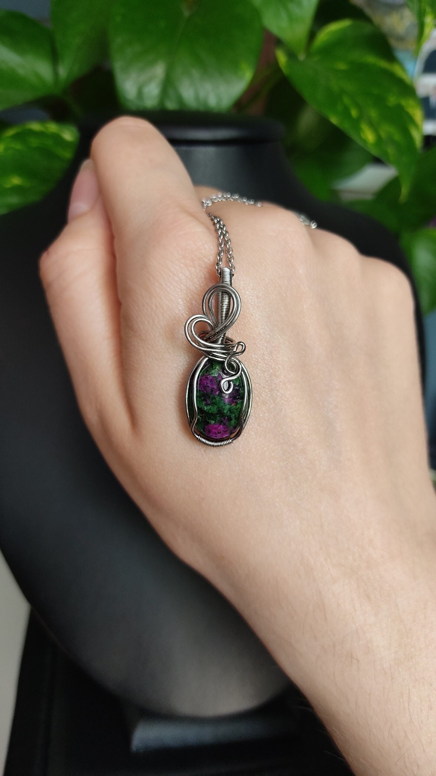 Ręcznie robiony wisiorek z zoisytem z rubinem. Wykonany techniką wire wrapping z drutów ze stali chirurgicznej.