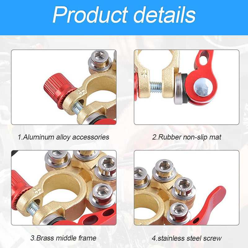 [4-KIERUNKOWY ZACISK AKUMULATORA] Wykonany z wysokiej jakości mosiądzu i stali, odpornej na korozję i charakteryzującej się doskonałą przewodnością elektryczną, która redukuje zniekształcenia napięcia i straty przesyłu. Posiada 4 porty do podłączania wielu kabli, co ułatwia i uprzyjemnia modyfikację okablowania.