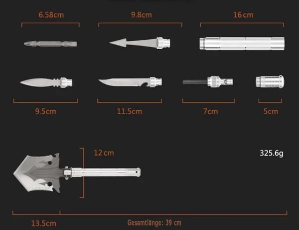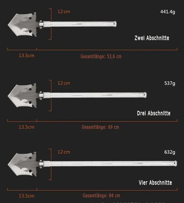 Łopata survivalowa wykonana z mocnego materiału - Głowica łopaty wykonana jest ze stali, rączka i przedłużacze ze stopu aluminium. Zaprojektowane i wyprodukowane z myślą o entuzjastach sportu i outdooru. To składane narzędzie jest doskonałym narzędziem do kopania, odpowiednim do użytku podczas biwakowania lub pieszych wędrówek.