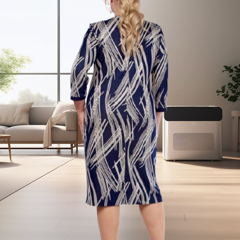 Pakuotės turinys: 1 * Elegantiška moteriška abstraktaus rašto suknelė septynių ketvirčių rankovėmis.