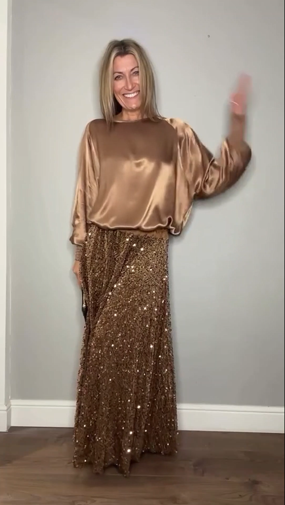 ΠΟΙΟΤΙΚΑ ΥΛΙΚΑ: Το απαλό τοπ που αναπνέει προσφέρει άνεση όλη την ημέρα, η μάξι φούστα με πούλιες είναι κατασκευασμένη από ανθεκτικές πούλιες που μένουν ανέπαφες και διατηρούν τη λάμψη τους ακόμα και μετά από πολλές φορέσεις.