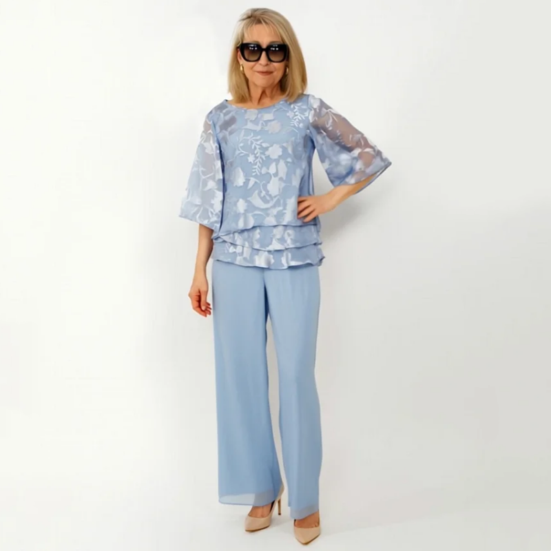 Elegantiški moteriški viršutiniai drabužiai su kaklaraiščiais ir plačiomis kelnėmis komplekte-LT