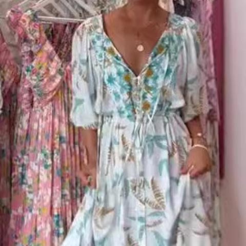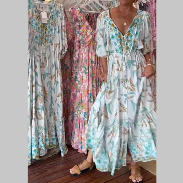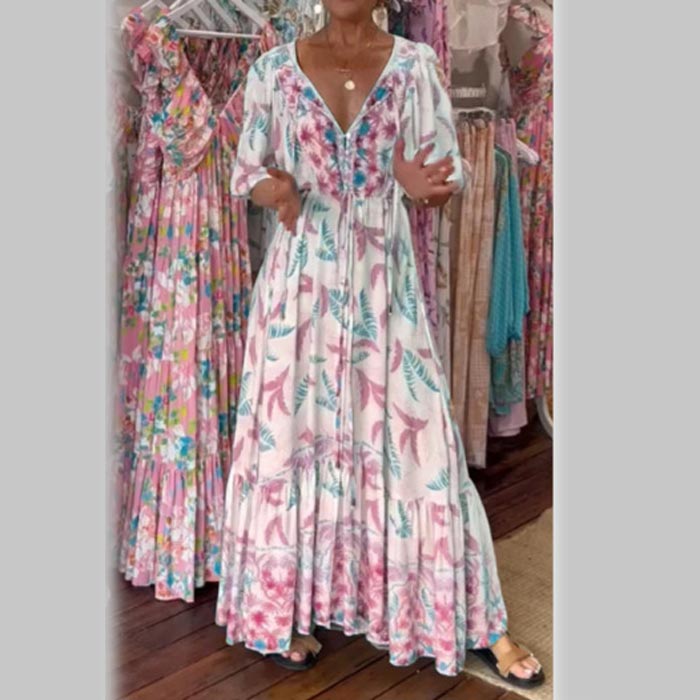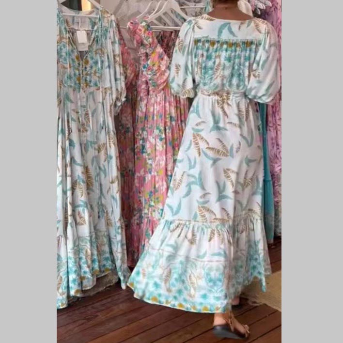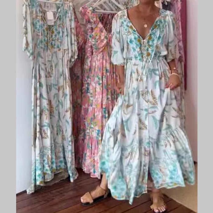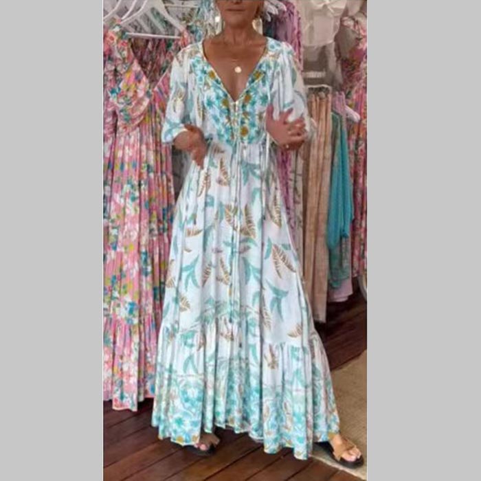 BOHEMĖS ĮKVĖPTAS DIZAINAS: Ryškūs raštai ir plaukiojantis maksi ilgis įkūnija bohemišką stilių, todėl ši suknelė puikiai tiks vasaros festivaliams, paplūdimio vakarams ar kasdieniams pasisėdėjimams demonstruojant unikalų mados pojūtį. Jis gali būti lengvai derinamas su aukštakulniais ar sandalais pusiau oficialioms ir kasdienėms progoms, todėl tai yra universalus drabužių spintos elementas.
