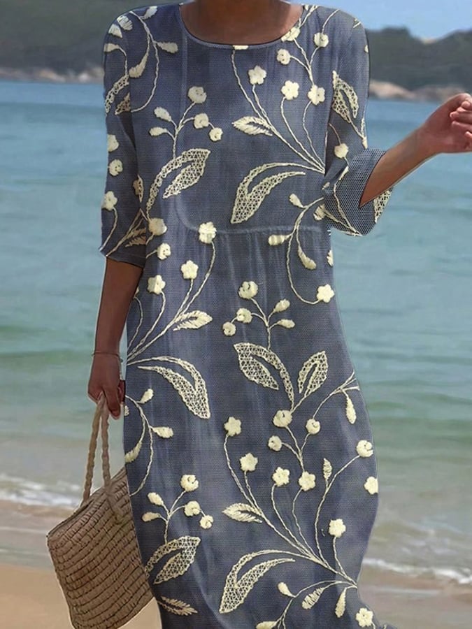 Γυναικείο Μονόχρωμο Φόρεμα με Στρογγυλή Λαιμόκοψη από Βαμβάκι και Λινό, Φλοράλ-GR