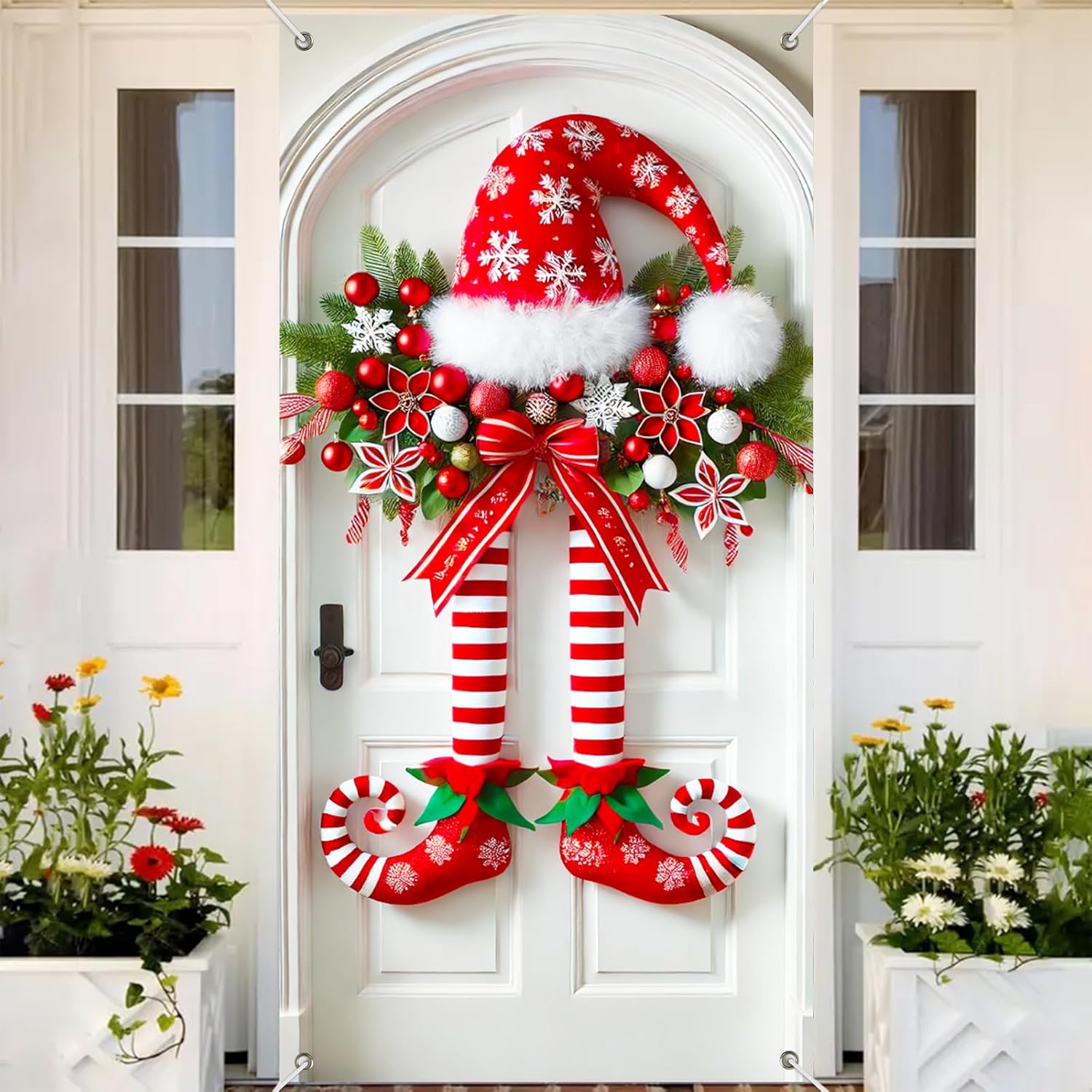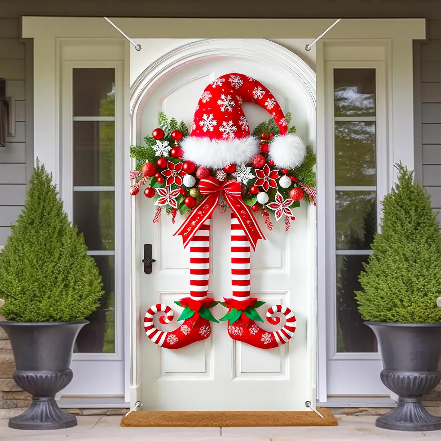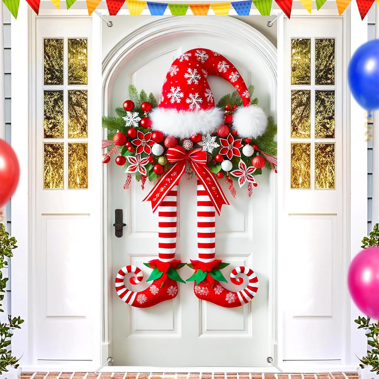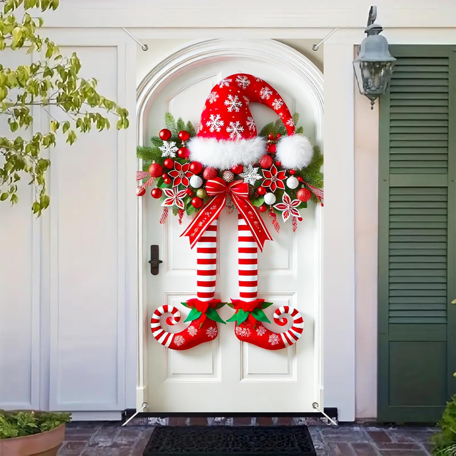 Linksmas elfų kojų dizainas: su dryžuotomis elfų kojomis, garbanotais batais, snaigės formos kepure ir šventinėmis dekoracijomis, ši reklaminė juosta sukuria gyvybingą kalėdinę atmosferą jūsų verandoje ar vakarėlyje.
