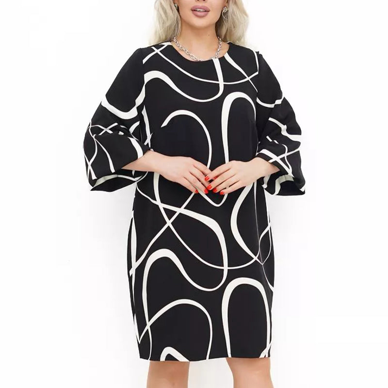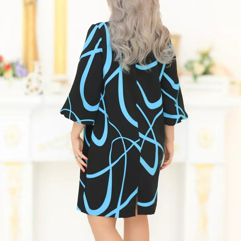 🌸 Raštuota suknelė apvalia iškirpte ir septynių ketvirčių rankovėmis-LT