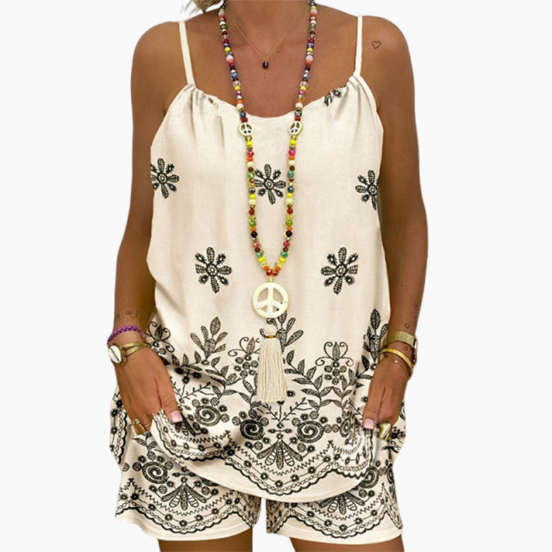 Universalus komplektas: šį stilingą dviejų dalių komplektą sudaro palaidinė su petnešėlėmis ir derantys šortai, kuriuos galima dėvėti su kitais drabužiais arba derinti su jais, kad būtų galima sukurti įvairių stiliaus variantų.