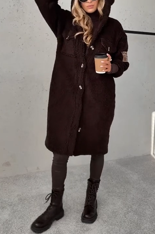 Moteriškas megztas ilgarankovis šiltas kailinis paltas su gobtuvu ir sagomis žemyn-LT