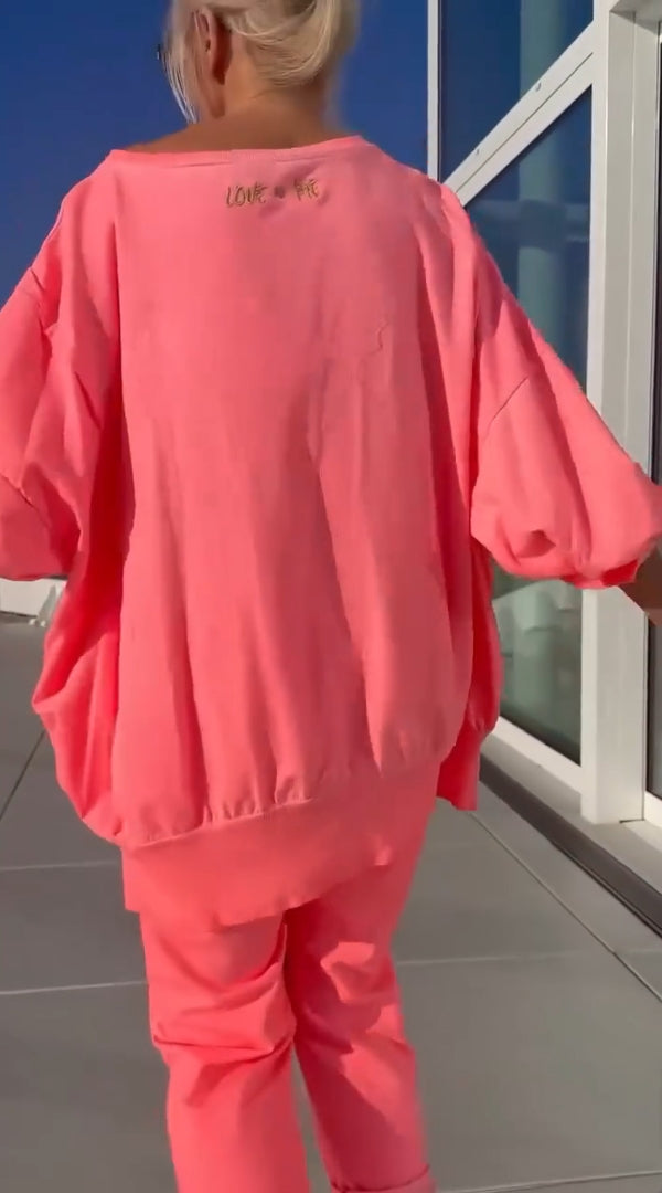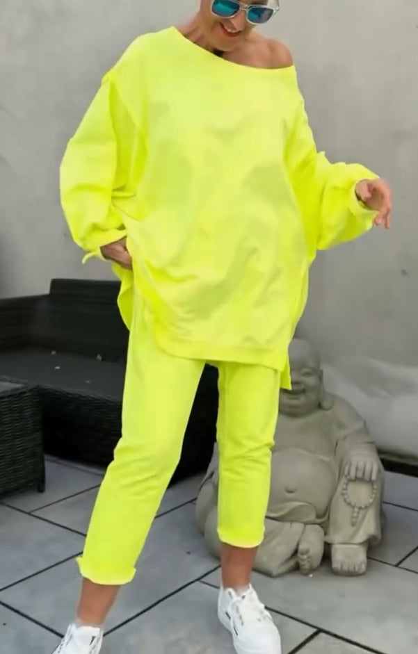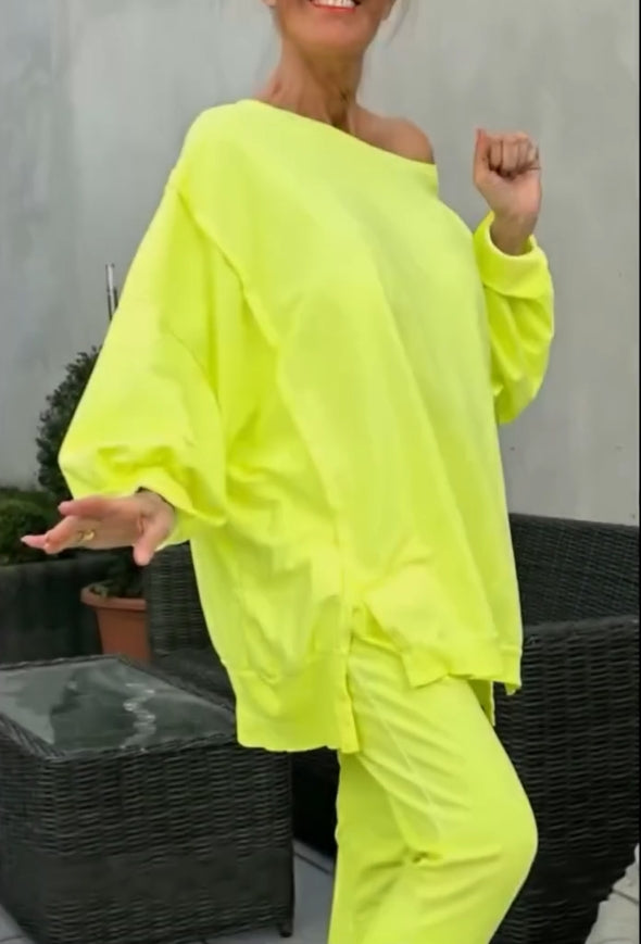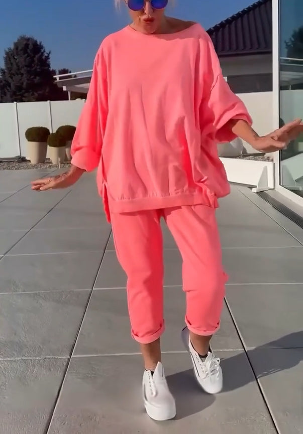 Γυναικείο καλοκαιρινό casual κοστούμι με στρογγυλή λαιμόκοψη, ανοιχτόχρωμο και σκίσιμο-GR