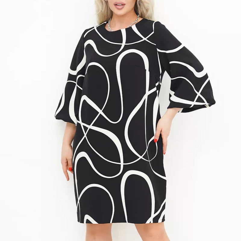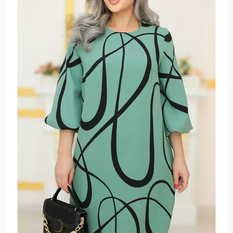 🌸 Φόρεμα με στάμπα, στρογγυλή λαιμόκοψη και μανίκια επτά τετάρτων-GR
