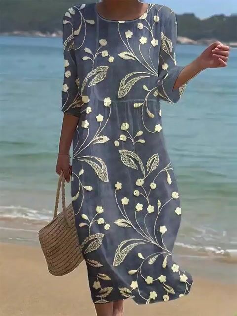 Ženska enobarvna obleka iz bombaža in lana z okroglim izrezom in polcvetličnim vzorcem-SI