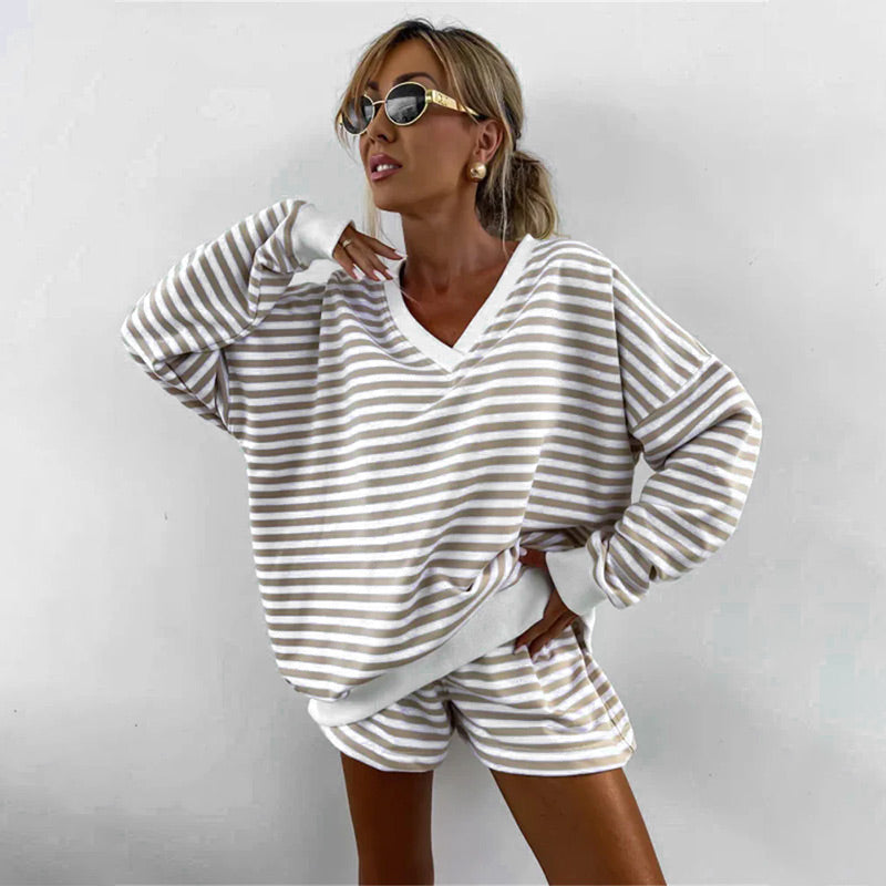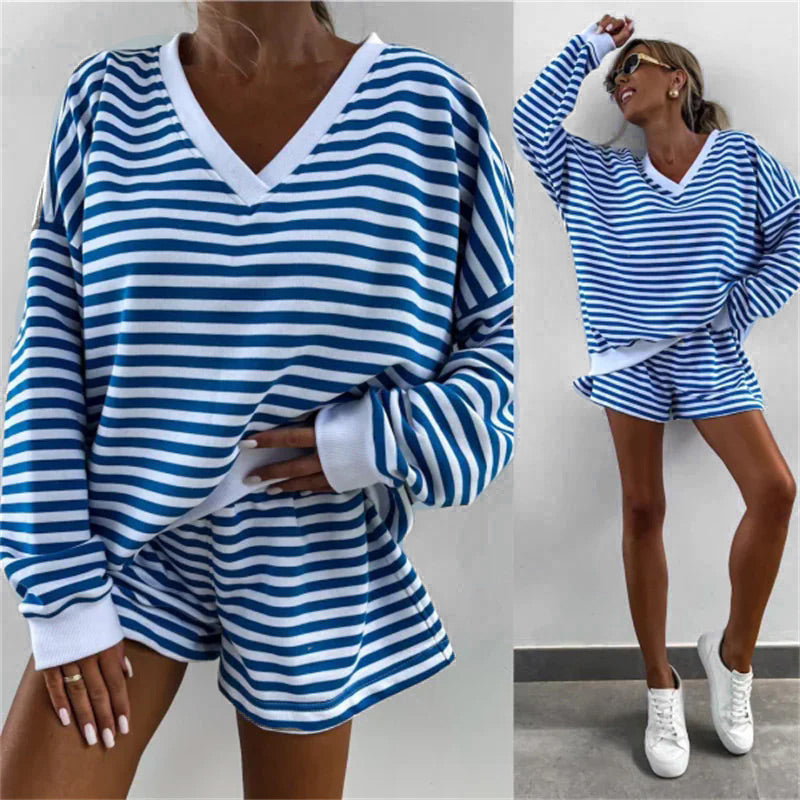 Dvojdielna dámska apranga Dryžuota V formos iškirpte Laisvi horný dalis ir šortai