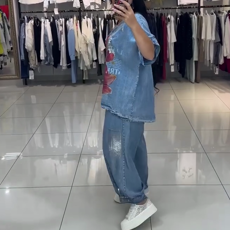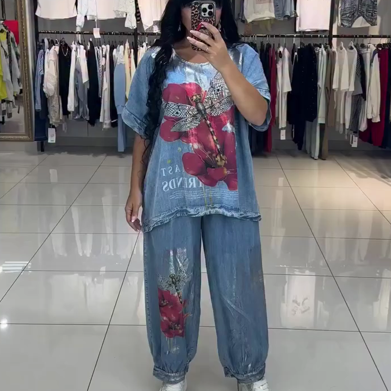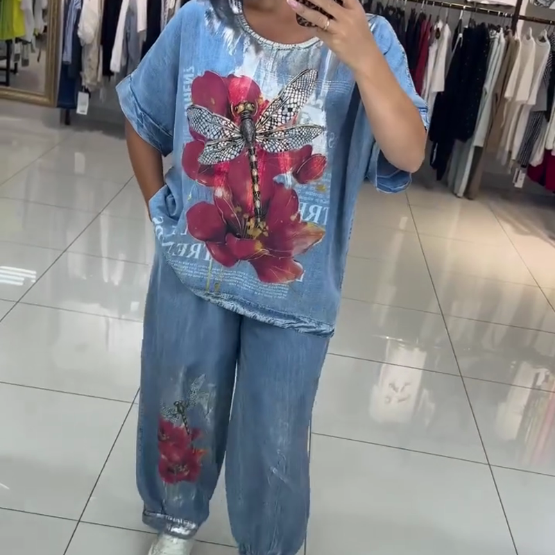 ΦΩΤΕΙΝΟ ΣΧΕΔΙΟ ΕΚΤΥΠΩΣΗΣ – Αυτό το σετ διαθέτει εντυπωσιακά σχέδια με κόκκινα λουλούδια και λιβελούλες. Αυτά τα έντονα σχέδια στο μπλε κοντομάνικο τοπ και στο ασορτί φαρδύ τζιν δημιουργούν μια διασκεδαστική και κομψή εμφάνιση, προσθέτοντας μια μοναδική πινελιά στο ντύσιμό σας.