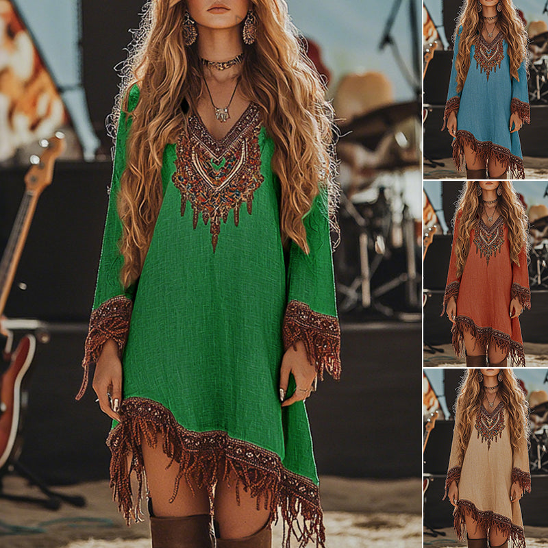 Kutais puoštos detalės – suknelės rankovės ir apačia puoštos kutais. Ši rudo atspalvio suknelė pasižymi tamsiai raudonais kutais ant rankovių ir apačios, o kitų spalvų suknelės išlaiko kutus. Kutai suteikia suknelei dinamiškumo, suteikia jai ryškų, retro pojūtį.
